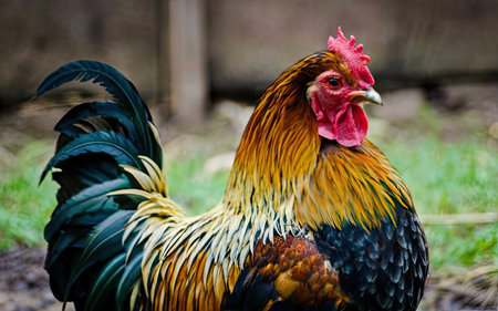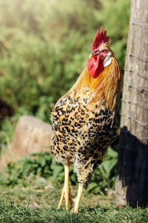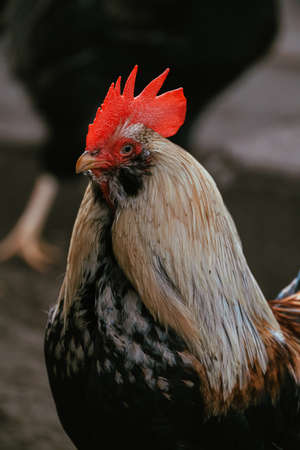 close up of a breed rooster in the yard, portrait of a farm rooster in the yard