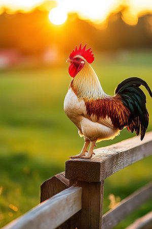 A majestic rooster perches confidently on a sturdy wooden fence as the sun rises, casting a warm glow over the farmyard, embodying the tranquility and beauty of morning on the farm.