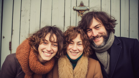 Four friends, two men and two women, are beaming with joy against a cloudy sky, showcasing their close bond. Their vibrant expressions and playful hairstyles reflect a carefree moment of friendship and happiness, perfect for capturing the essence of togetherness.