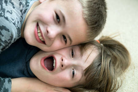 Two children boy and girl fooling around having fun together. Happy childhood concept.