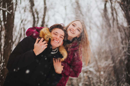 Beautiful young teen couple spending time together outside in cold winter. Happy and joyful people