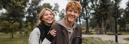 happy blonde woman hugging cheerful redhead boyfriend smiling in autumnal park, banner