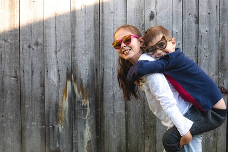 Two cute kids in casual clothes and funny sunglasses, sister carries her little brother in her arms, wooden background, copyspace
