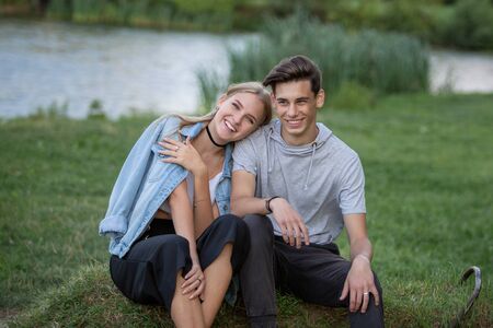 Portrait of a beautiful young couple in love. Teenagers Man and woman outdoors