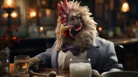 A humorous shot of a chicken wearing glasses, standing on a rustic wooden background, adding a playful touch to the scene.