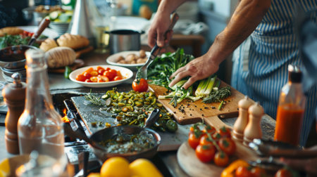 A vibrant kitchen scene showcasing chefs preparing fresh ingredients on a wooden table, emphasizing culinary creativity and the joy of cooking.
