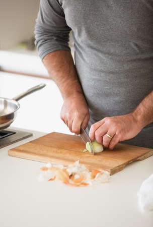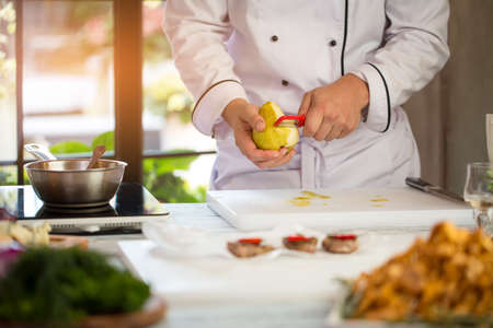 Man's hand peeling a pear. Chef near white cooking board. Sweet ingredient for sauce. Need fresh fruit.