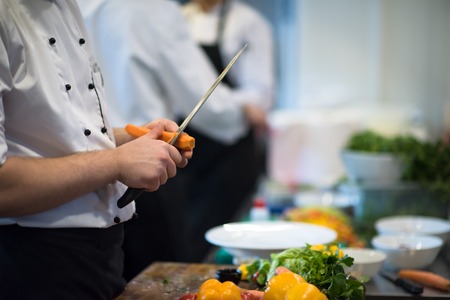 chef hands cutting carrots on a wooden table preparation for meal at restaurant