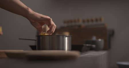 Unrecognizable man with tattooed hands cooking something in kitchen at home pouring sesame seeds into warm frying pan