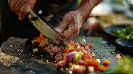 Close up of unrecognizable cook cutting onions and other vegetables with chef knife while working