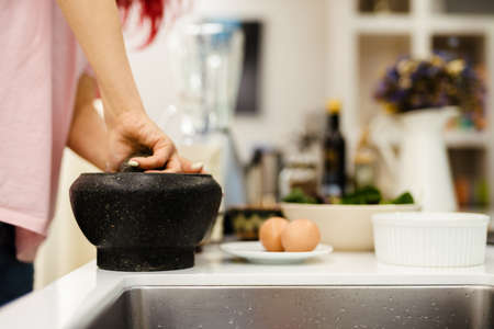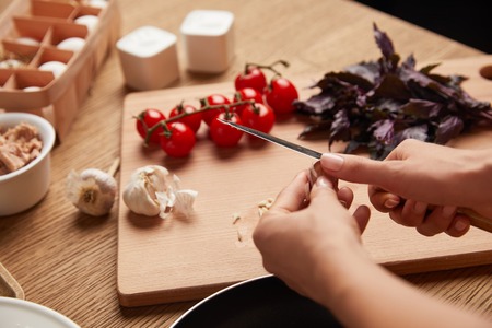 A woman in the kitchen is chopping garlic on a cutting board. Cooking delicious duck for the holiday.