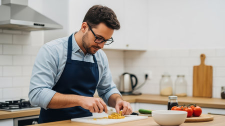 Close-up mid section of a Asian man, wearing a kitchen apron, reading a recipe book in the kitchen at home. Complex ingredients on table.