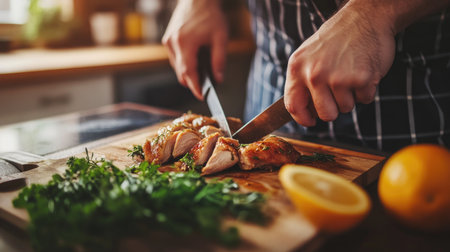 A chef skillfully slices roasted chicken on a wooden cutting board, surrounded by fresh herbs and citrus fruits in a warm, inviting kitchen ambiance.