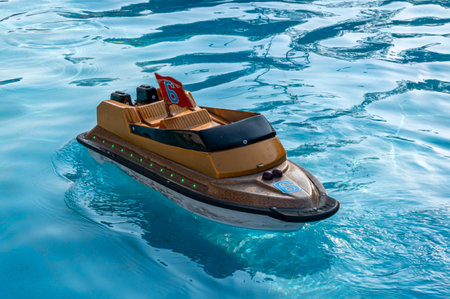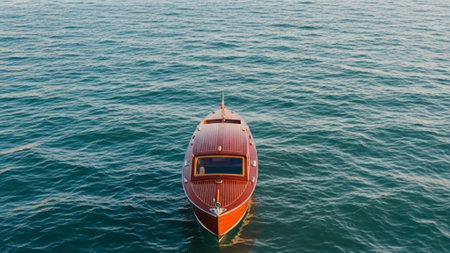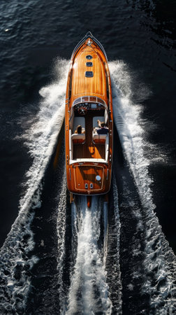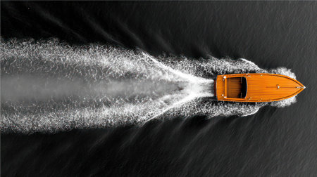 An overhead view captures a wooden motorboat navigating a dark body of water. The boat is depicted in warm tones, creating a contrast with the cool, dark backdrop. Water trails indicate movement, with bright highlights suggesting a sunny day. This image is suitable for various commercial purposes and editorial content.
