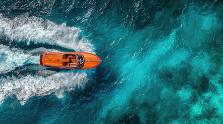 An overhead shot captures an orange speedboat moving swiftly across vibrant turquoise water. The boat carves through the waves, producing a dynamic white wake. The composition highlights the contrast between the boat and water, suitable for projects related to travel, leisure, and aquatic themes. The image may be used in commercial and editorial contexts.