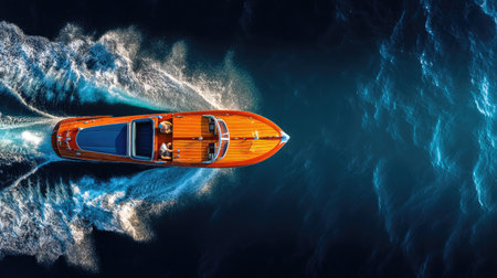 An overhead view displays an orange motorboat cruising over dark blue water, generating white foamy waves. The boat's design suggests a recreational activity under bright daylight. This image could be used for various commercial projects related to travel, leisure, and transportation, or editorial content.