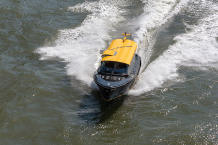 Rotterdam, Netherlands - April 18, 2019 : Water taxi speeding over the new Meuse river aerial view