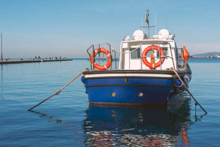 fishing boat moored near pier by bright sunny day in Trieste, Italy