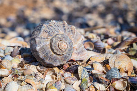 A large shell on small shells - The texture of shells in close-up. The empty shell of the rapana venosa marine mollusk. conch on the shore.