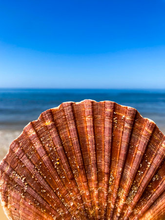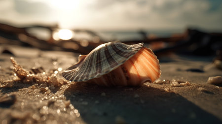 AI Generated. Seashell on sandy beach with horizon and sky