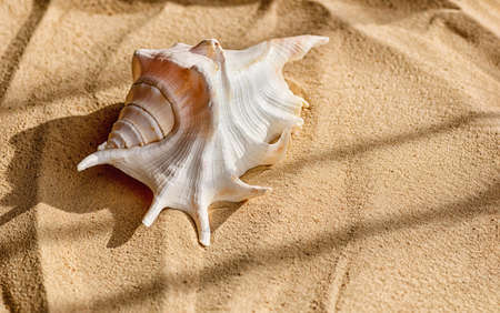 A beautiful big shell lies on the sea sand. The shadow of a palm tree. The concept of a summer vacation at sea and travel. Close up.