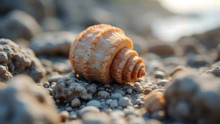 A detailed close-up of a seashell with a spiral pattern rests on a bed of small pebbles near the seashore, showcasing the beauty of nature.