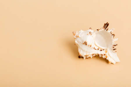 Beach seashells on colored background. Mock up with copyspace.
