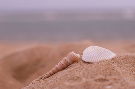 Close-up of two shells on the beach with sea on background, shallow DOF, soft focus.