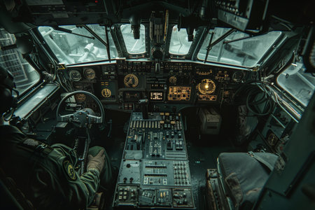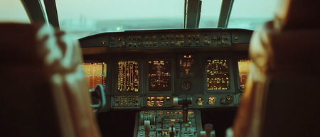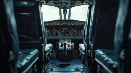 Empty airplane cockpit with control panels in a quiet flight environment