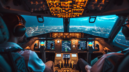 Pilot navigating a modern airplane cockpit illuminated by instrument lights, viewing a sprawling city from high above during an evening flight, symbolizing technology and travel