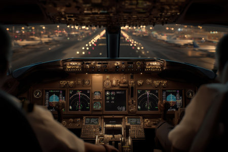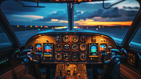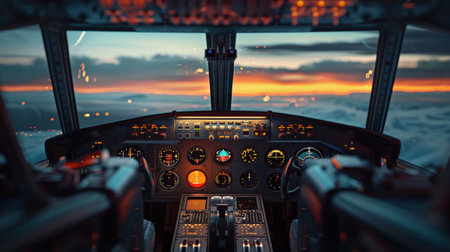 Empty Airplane cockpit with illuminated control panels and scenic view, concept of aviation, aircraft operation, pilot training.