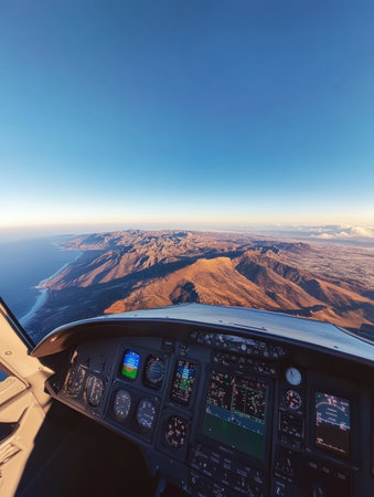 A breathtaking panorama showcases a cockpit view with mountains, ocean, and coastline clearly visible under bright skies.