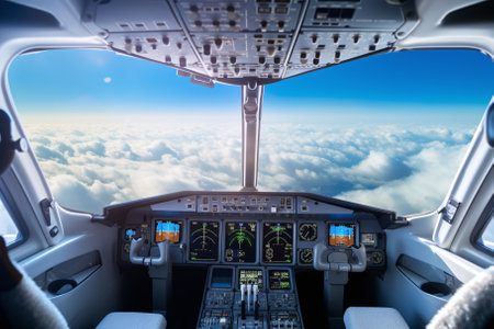 Quiet airplane cockpit with advanced control panels and serene flight environment