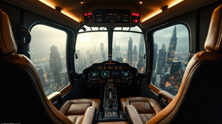Helicopter cockpit interior with leather seats and a city skyline visible through the windows.