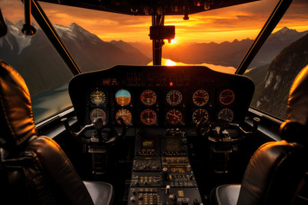 Helicopter cockpit at sunrise in the mountains with beautiful sky in the background over the mountains, Ai generated