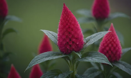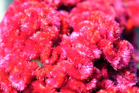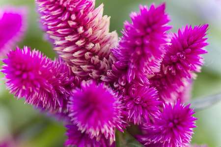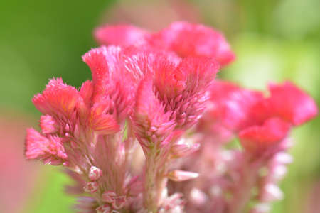 Pink flowers on green background. Beautiful flowers background for wedding scene. Celosia cristata tropical flower closeup. Macro photo of jungle flower Celosia. Deep red furry celosia flower image