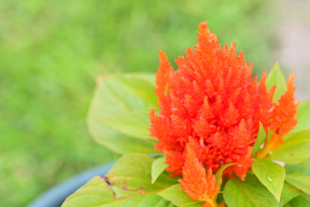Cocks comb vivid flowers beautiful color with leaves in park background