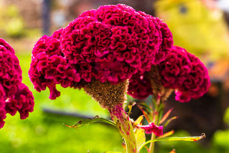 Bright dark pink flower celosis blooming in the garden on the green background. Early autumn