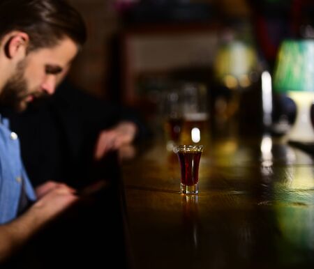 Glass of shot or whiskey on wooden bar counter. Man sits near glass of alcohol beverage. Friday night, service and alcohol concept. Glass of shot or liqueur on blurred bar background.