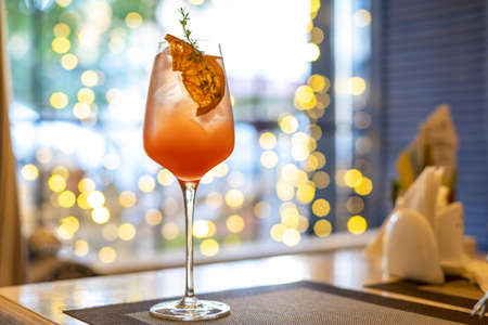 Alcohol cocktail drink on the table in restaurant with bokeh background