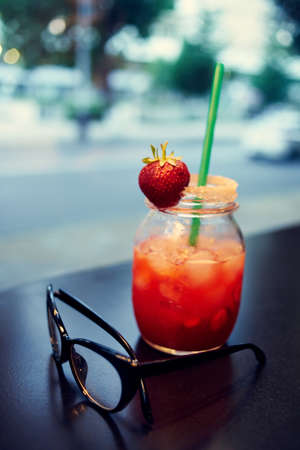 Cold lemonade with strawberries, mint and ice on the outdoor veranda summer day, sunlight.