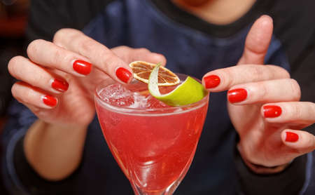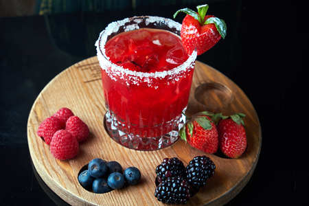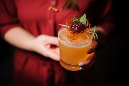 Barman holding a glass of cold fresh juicy berry alcoholic cocktail