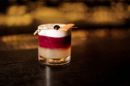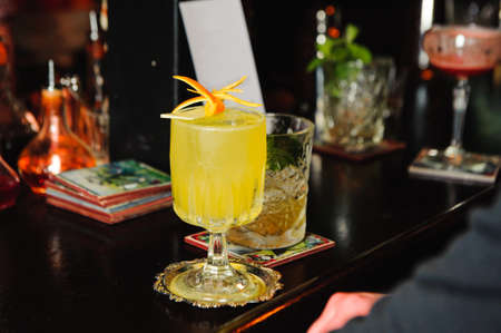 ice cold modern Cocktail gourmet craft white with Sweet caramels decoration slice Author Drink - on bar counter . Close-up Top view . Copy paste space design barman people and luxury nightclub