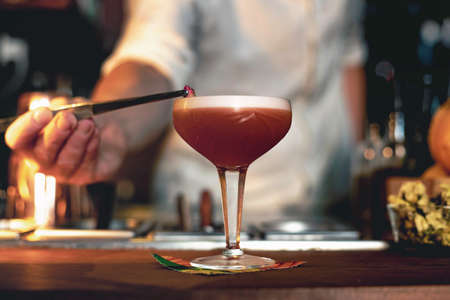 View of a professional bartender kindly garnishing with fruits a cocktail in a beautiful cocktail bar.