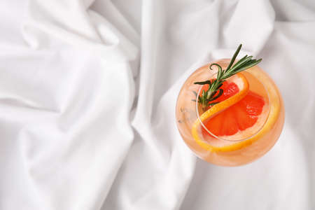 Glass of cocktail with rosemary and dried citrus fruits on color wooden background