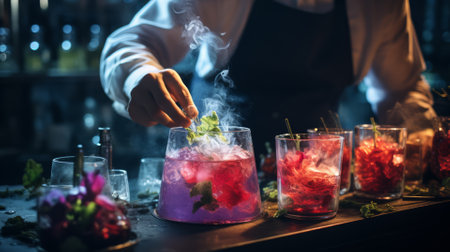 Bartender crafting detailed non-alcoholic cocktail with slow motion highlights.