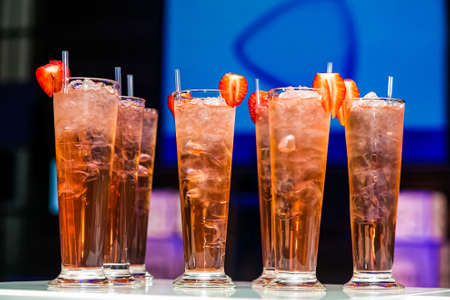 Close up glass of Cocktail on the table. Ready long drink. Bar drinks series