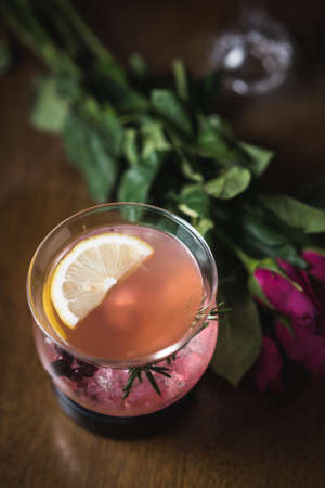 Fresh cocktail drink with ice fruit and herb decoration. Alcoholic, non-alcoholic drink-beverage at the bar counter in the pub restaurant or night club.