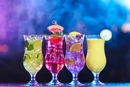 Variety of alcoholic cocktails on bar counter. Colorful drinks.