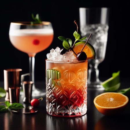 Stunning array of assorted colorful cocktails with garnishes, elegantly presented on a dark bar backdrop